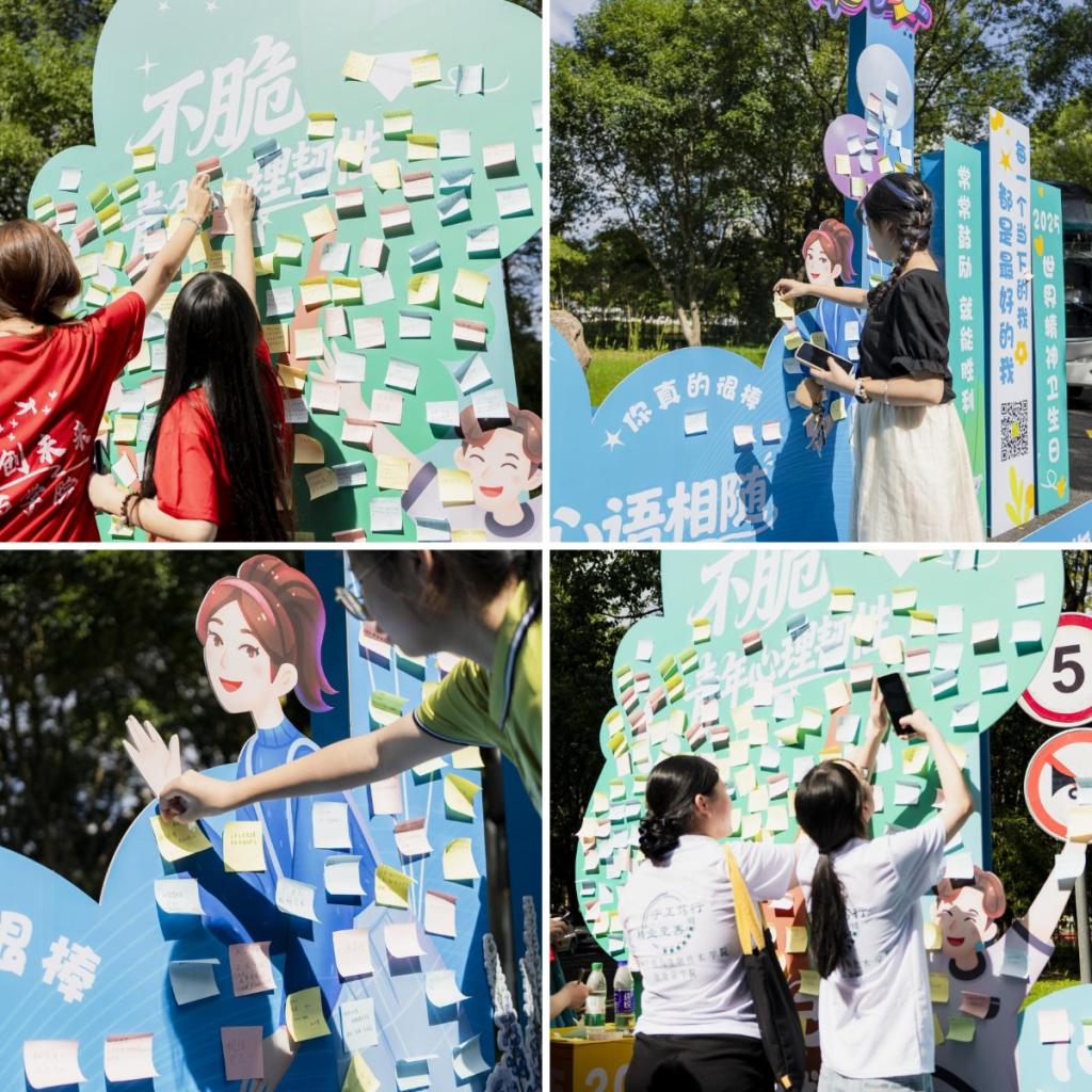 一旁的留言板上,学生们写下的“爱自己的100种方式”便签层层叠叠,温情满满,展现我校学子积极心理状态。