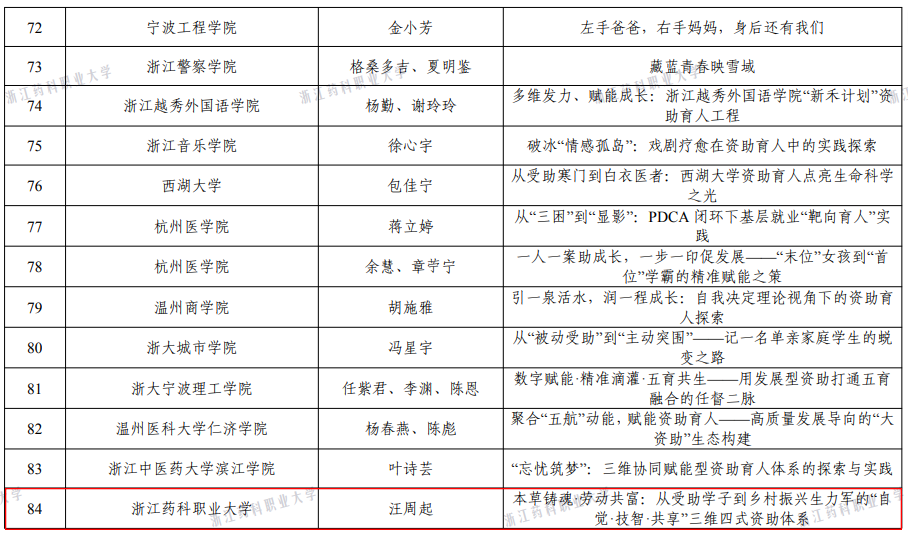 近日,从浙江省教育厅获悉,我校中药学院辅导员汪周起老师撰写的《本草铸魂·劳动共富:从受助学子到乡村振兴生力军的“自觉·技智·共享”三维四式资助体系》获2025年浙江省学生资助育人工作典型案例。