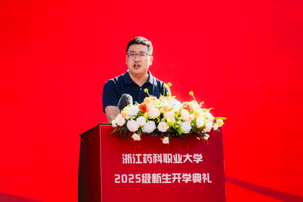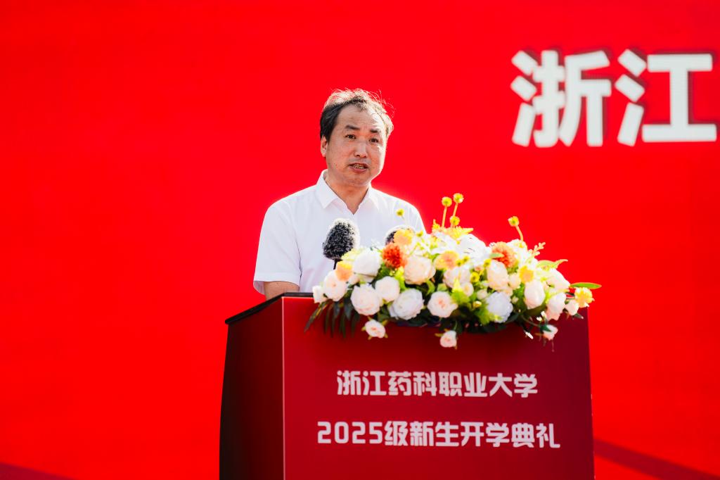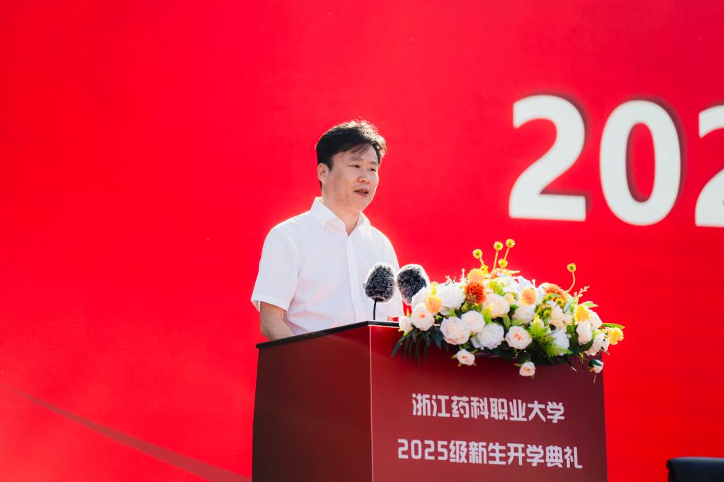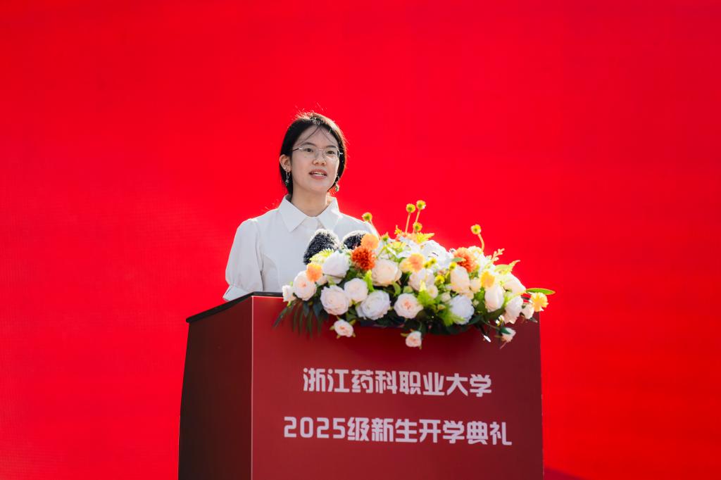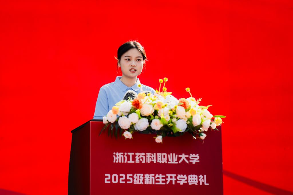 教师代表、药商学院教授施能进,校友代表、浙江省医药保健品进出口有限责任公司药材保健品分公司总经理傅杨群,在校生代表、中药学院2023级中药学专业学生陈亦雪,新生代表、药学院25级药物制剂专业学生周姝含分别发言,表达对2025级新生的欢迎和祝福,寄语新生加快青春步伐,不负美好时光、只争朝夕,在浙药大校园里吸收养分茁壮成长,早日成为祖国医药事业的中流砥柱。