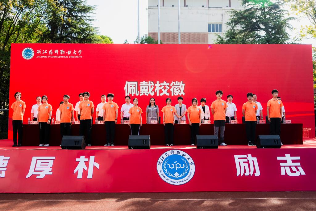典礼在庄严激昂的国歌声中拉开帷幕。学校领导首先为新生代表佩戴浙江药科职业大学校徽,校徽是学校的标志,也是学校精神的体现,希望2025级新同学们以浙药精神和校训精神为指引,担当时代使命、不负青春韶华,用新时代浙药学子奋发活力谱写青春华章。