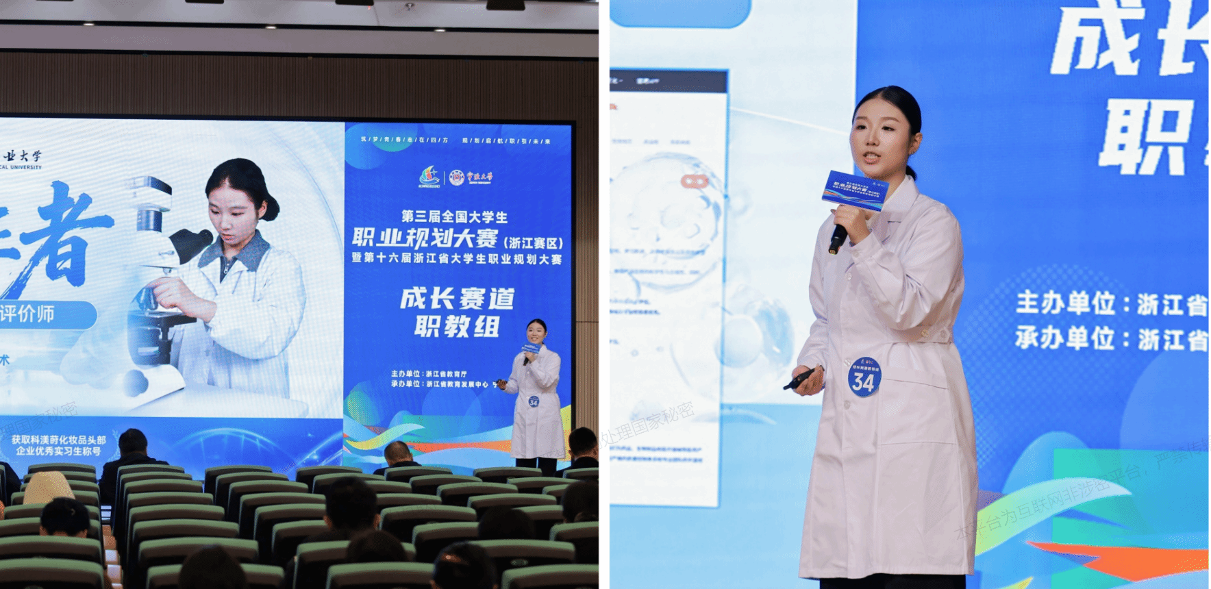 本次大赛中,制药工程与生物技术学院、化妆品学院朱滢睿同学以“化妆品功效评价师”为职业目标,凭借清晰的职业发展路径、详实的实践成果与深厚的专业素养,生动展现了新时代浙药学子立足行业产业特色、锚定专业细分领域、服务产业高质量发展的责任与担当,最终在成长赛道的激烈角逐中脱颖而出,成功摘得金奖。成绩背后凝聚了全校师生的心血,比赛从院赛、校赛一路到省赛舞台,校领导们始终倾注关心关怀,通过不同的形式为比赛提供指导和帮助,各学院广泛发动、全程发力推动比赛,充分展示了学校上下一盘棋、合力促育人的良好风貌。