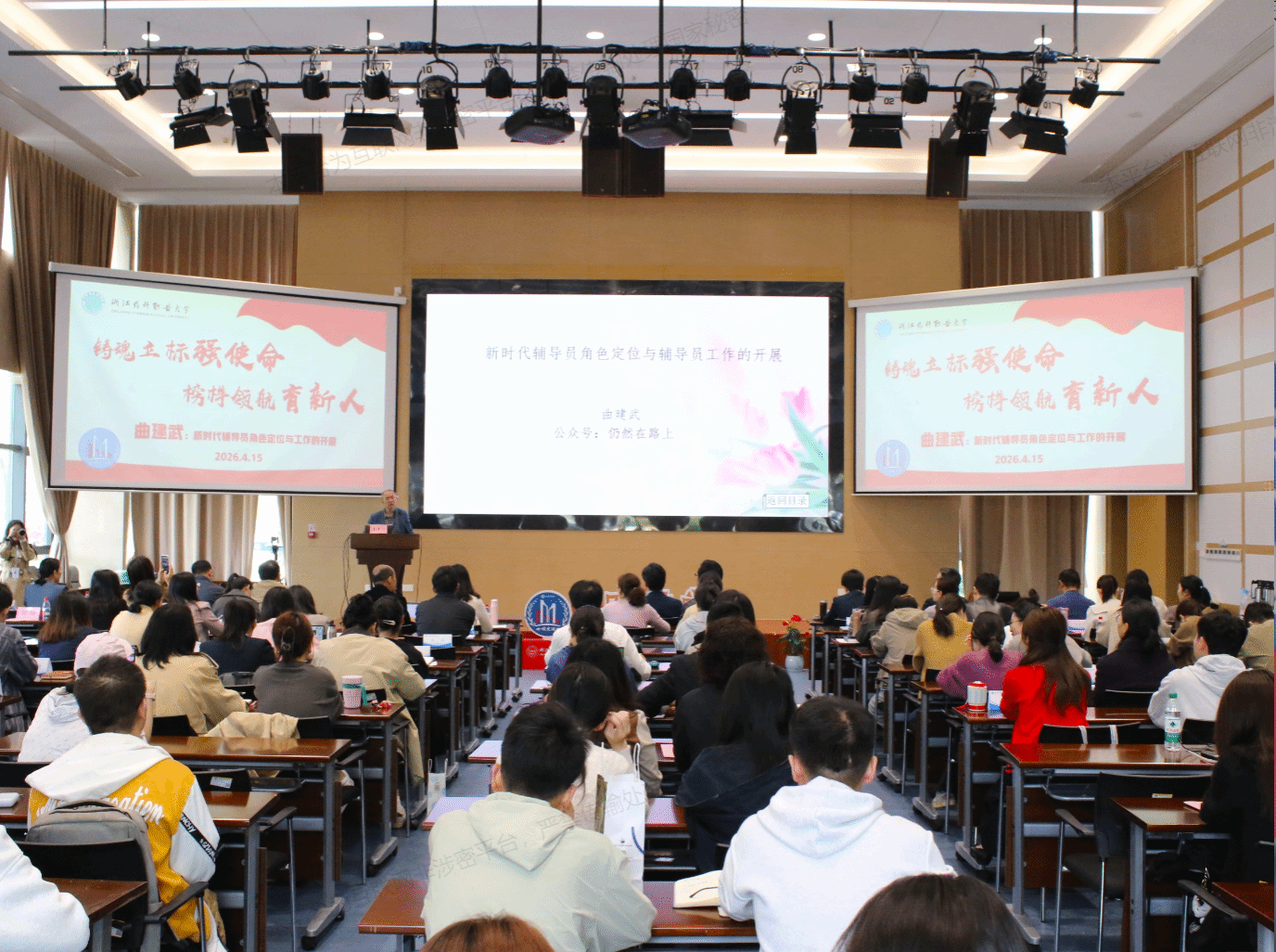 为大力弘扬教育家精神,扎实推进新时代立德树人根本任务,助力职业本科教育高质量发展,4月15日,“时代楷模”、全国道德模范、大连海事大学曲建武教授受邀做客浙江药科职业大学“四明大讲堂”,以《新时代辅导员角色定位与工作的开展》为主题,为全校师生带来一场兼具思想深度与育人温度的专题讲座。本次活动作为2026年“学在浙药”辅导员领雁育人论坛的重要环节,由药商学院承办,校党委副书记沈黎新主持,学校各学院党委(党总支)书记、副书记、团委负责人、学生工作部(学生处)全体人员、全体辅导员、思政教师代表及学生代表齐聚奉化校区行政楼111会议室,共沐楷模光辉,共探育人之道。